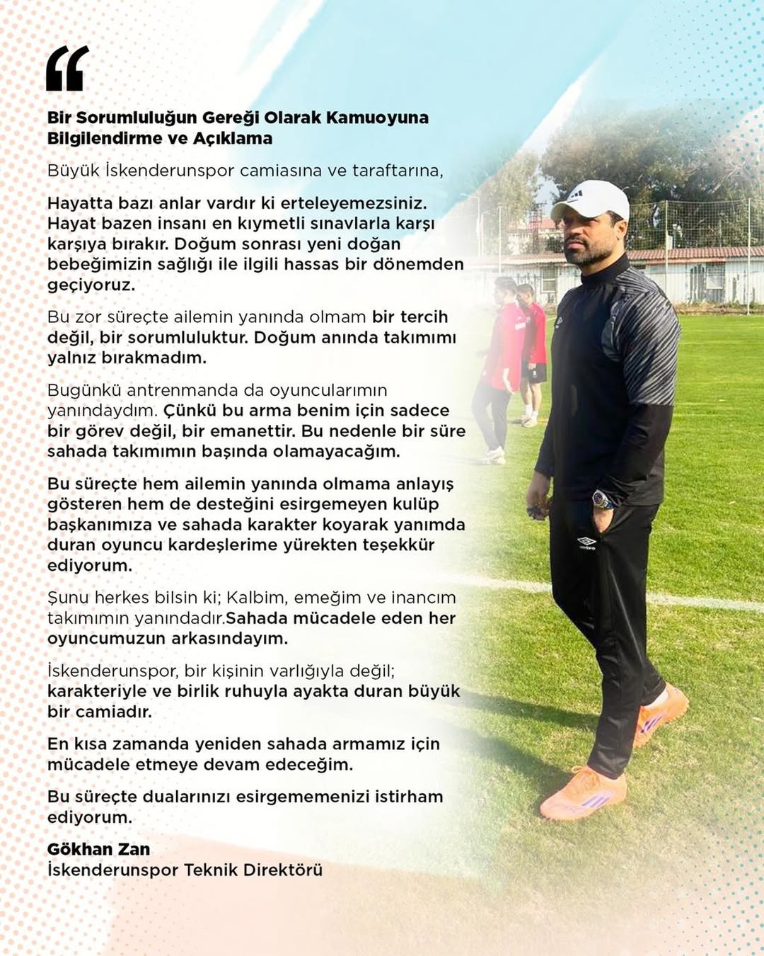 İskenderunspor Teknik Direktörü Gökhan Zan, yeni doğan bebeğinin sağlık sorunları nedeniyle bir süre takımın başında sahada yer alamayacağını duyurdu. Zan, yaptığı açıklamada “Kalbim ve inancım oyuncularımla” diyerek taraftardan dua istedi.