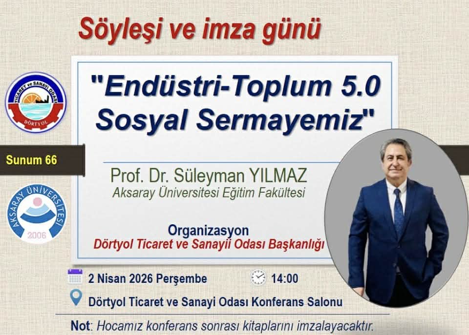 Dörtyol Ticaret ve Sanayi Odası, önemli bir akademik buluşmaya ev sahipliği yapmaya hazırlanıyor. Aksaray Üniversitesi Eğitim Fakültesi öğretim üyesi Prof. Dr. Süleyman Yılmaz, düzenlenecek özel bir söyleşi ve imza gününde katılımcılarla bir araya gelecek.