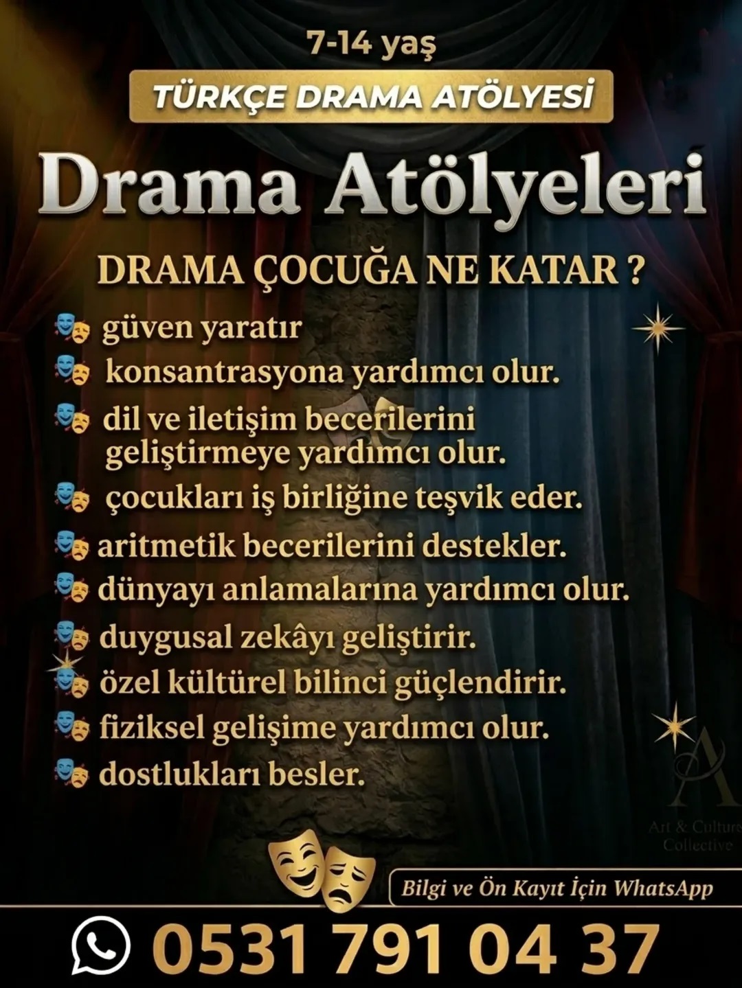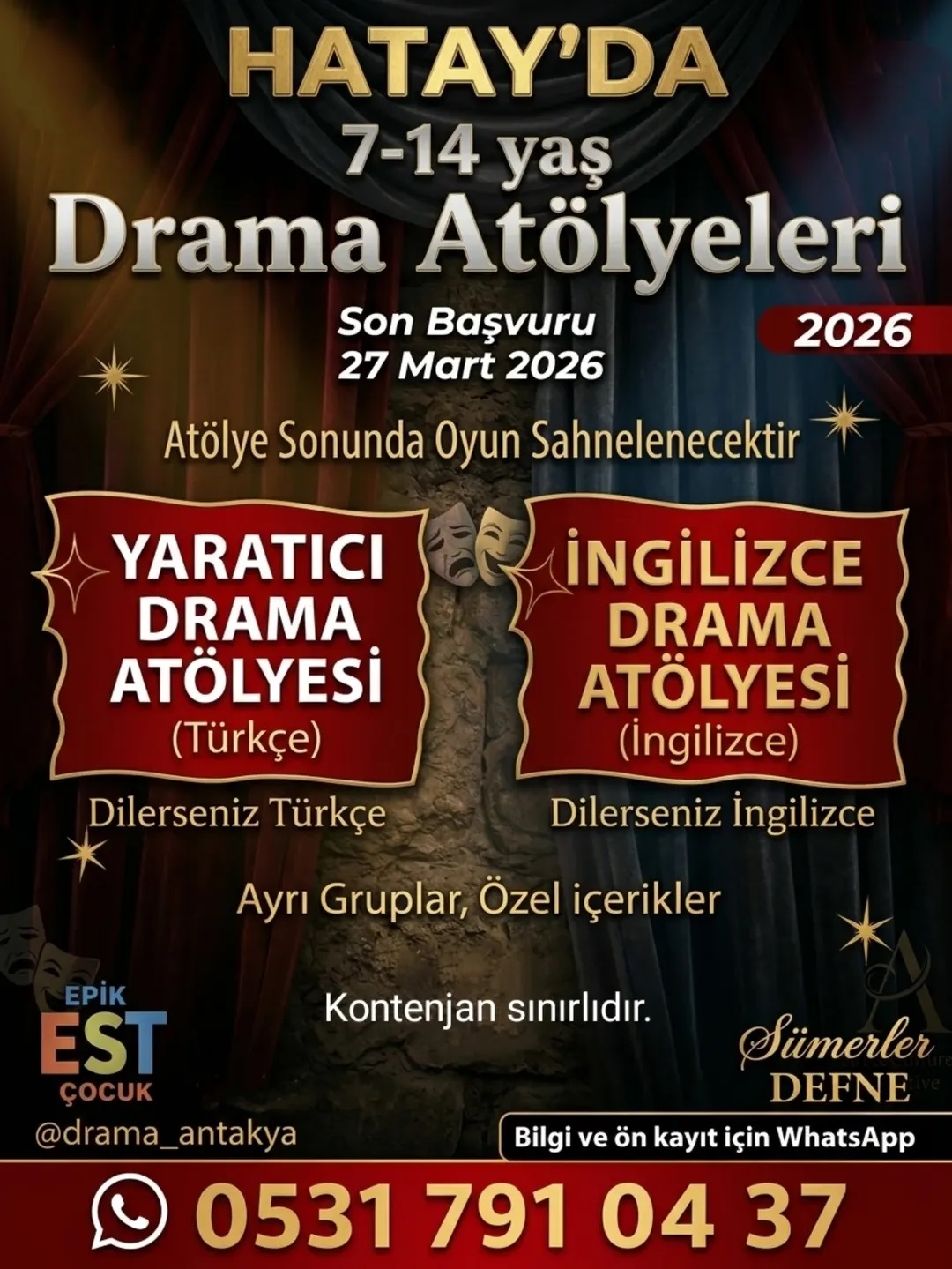 Sınırlı kontenjanla açılan sınıflar için son başvuru tarihi 27 Mart 2026 olarak belirlendi. Ayrı gruplar ve özel içeriklerle hazırlanan bu eğitim yolculuğuna katılmak isteyen veliler, detaylı bilgi ve ön kayıt için sosyal medya üzerinden @drama_antakya hesabını takip edebilir veya doğrudan iletişim hattına ulaşabilirler.