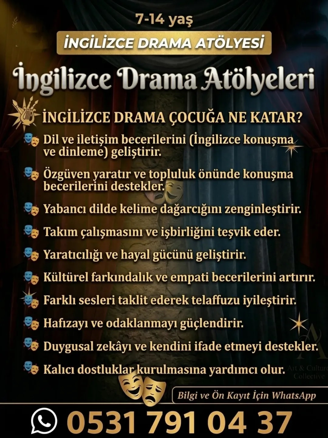 Dil öğrenimini sahne sanatlarıyla birleştirerek; telaffuz iyileştirme, kelime dağarcığını zenginleştirme ve topluluk önünde yabancı dilde konuşma cesareti aşılıyor.
