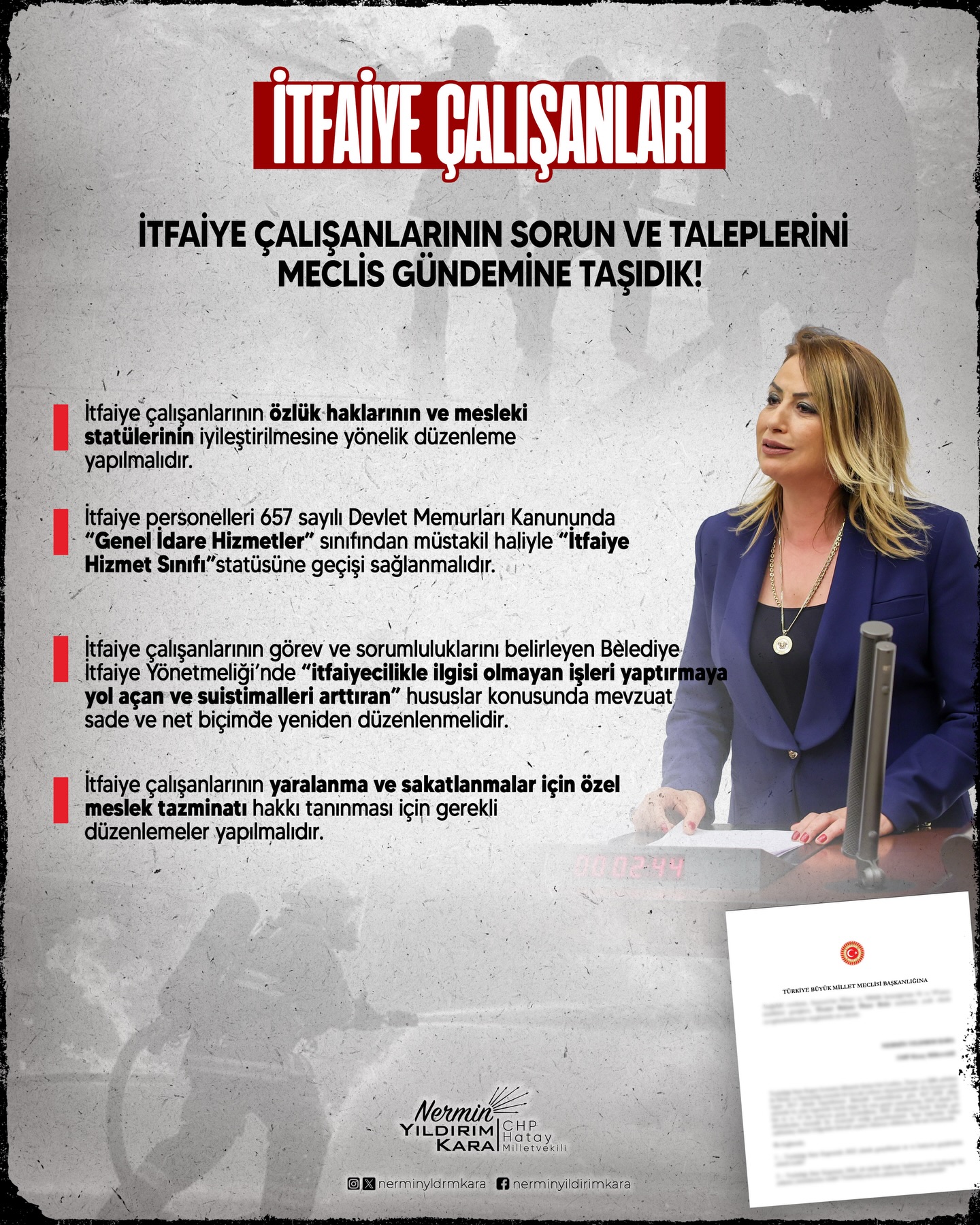 CHP Hatay Milletvekili Nermin Yıldırım Kara, her türlü afet ve yangın felaketinde canlarını dişine takarak görev yapan itfaiye çalışanlarının kronikleşen sorunlarını ve taleplerini Türkiye Büyük Millet Meclisi (TBMM) gündemine taşıdı.
